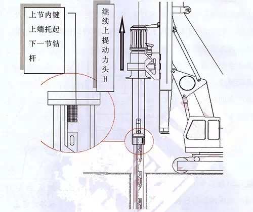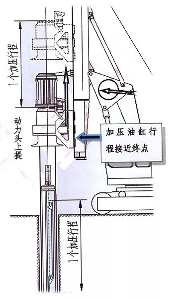 5.一個(gè)工作循環(huán)結(jié)束,重復(fù)循環(huán),直至成孔。(經(jīng)多個(gè)工作循環(huán)后,加壓油缸行程接近終點(diǎn)時(shí),應(yīng)將加壓油缸向上拉起約一個(gè)加壓行程,以便快速找到鉆桿的下一個(gè)加壓鎖點(diǎn),繼續(xù)向下鉆進(jìn))。