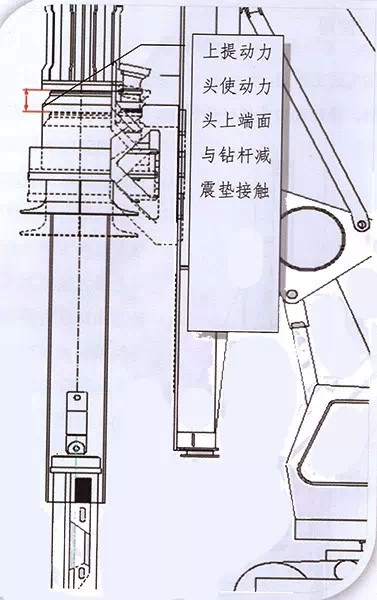 (1)上提動(dòng)力頭使動(dòng)力頭上端面與鉆桿減震墊接觸釋放加壓油缸加壓力。